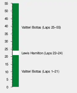 After the front-runners all made a good start, positions at the front of the field did not change from the start grid into the opening laps. Mercedes driver Bottas retained first place from pole position. Hamilton followed Bottas closely, able to challenge for position at times. Hamilton later congratulated Bottas on his dominant performance, saying the former 'gave it everything, every single lap'.[11] Bottas said that he had been "managing the pace and that way the race", and "it was a nice feeling, a really nice feeling",[11] suggested he could have pushed harder. Indeed, Bottas set the fastest lap of the race in the closing stages.