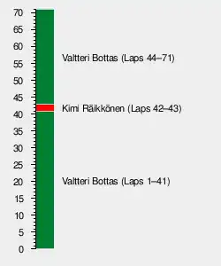 At the start Valtteri Bottas made a perfect get away to lead Sebastian Vettel into the first corner, behind them there was problems with Daniil Kvyat hitting Fernando Alonso who then in turn hit Max Verstappen, both Alonso and Verstappen retired, Kvyat was given a drive through penalty for causing the accident. Bottas came under investigation for a jump start but the stewards issued no penalty. The rest of the race had little action until towards the end Vettel applied pressure on Bottas for the lead but ultimately he failed to get past Bottas who won the race. Daniel Ricciardo meanwhile held off Lewis Hamilton for the final podium spot allowing Vettel to extend his championship lead to 20 points.[6]