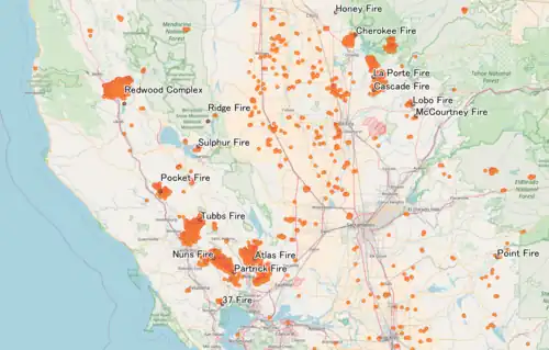 ![]() A map of wildfires in California in 2017, using Cal Fire data | |