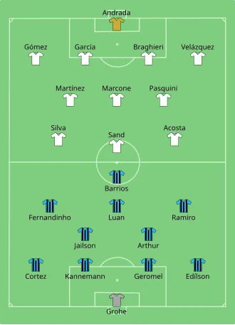 Grêmio scored twice before half-time. Fernandinho stole the ball in Gremio's half, ran freely toward Andrada's goal and hammered it home from the edge of the box in the 26th minute. In the end of the first half, Luan dribbled through two Lanus defenders and lobbied the ball gently into the net. In the second half, José Sand scored from the penalty spot in the 71st minute.[9][10]