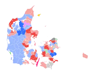 Local elections were held on 21 November 2017 for Denmark's 98 municipal councils and five regional councils. All 2,432[1] seats were contested for the 2018–21 term of office,[2] together with 205 seats (a fixed number of 41 seats in each council) in five regional councils.[3] In the previous election, there were 2,444 seats in the municipal councils.