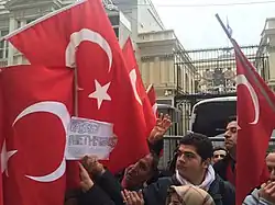 - Protesters in cities of Turkey including Kocaeli, were seen squeezing and sticking knives into oranges (a prominent symbol of the Dutch royal family; the orange color is also associated with the Netherlands). Some protesters also burnt the flags of France since they assumed French President François Hollande was the President of Holland (Netherlands).[23][24] Similarly, some Erdoğan supporters intended to call the Rotterdam police department and force the operators to listen to religious and nationalistic Turkish songs. However, they mistakenly called the police department of the town of Rotterdam in New York State, United States.[25] A man replaced the Dutch flag of the Dutch Consulate General in Istanbul with a Turkish one with some protesters making signs of the ultra-nationalist Grey Wolves and shouting "Allahu akbar", "Racist Holland", and "Damn Holland".[26][27]