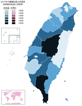 ![]() County level units won by Wu Den-yih. County level units won by Hung Hsiu-chu. | |||||||||||||||||||||||||||||||||||||