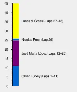 Di Grassi took the lead with d'Ambrosio second; both drivers were half a lap ahead of the battling drivers, who had more available electrical energy. Félix da Costa and his teammate Frijns joined the leading group of drivers after being under the minimum pit stop time by three seconds. The safety was deployed for the third (and final) time when Duval retired with a battery issue leaving the chicane. This allowed the field to close up to di Grassi and d'Ambrosio.[35][36] The safety car drove into the pit lane on lap 30 and di Grassi held the lead at the restart.[30] Vergne immediately pushed hard and attempted to pass López for third but the two drivers made contact at the turn three chicane. He attempted the same manoeuvre one lap later but López cut the chicane to avoid hitting Vergne who radioed that López cede the position.[32] Both Andretti cars were investigated because their pit stop times were faster the minimum permitted time of one minute because the team believed it was 57 seconds.[30][37] López drew near to d'Ambrosio and Vergne remained close behind López, allowing di Grassi to pull away from the field.[32][33]