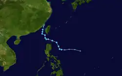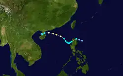 On June 10, the JMA started to track a tropical depression to the west of Manila, Philippines.[34] After the system entered a region favorable for further development, the depression rapidly organized, prompting the JTWC to start issuing advisories and give it the designation of 04W. A few hours later, 04W had intensified into a tropical storm, receiving the name Merbok as it starts to move in a north-northwestward direction.[34] On June 12, Merbok reached its peak intensity with 10-minute winds of 100 km/h (60 mph) and a minimum pressure of 985 hPa, shortly before making landfall in Eastern Shenzhen.[34][37] On June 13, the JMA issued its final warning on Merbok, as the system dissipated over China.[37][38]