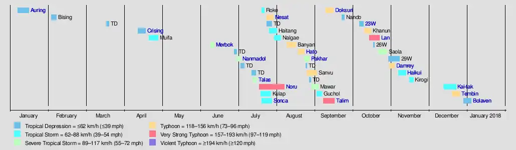 The 2017 Pacific typhoon season was a below-average season in terms of accumulated cyclone energy and the number of typhoons and super typhoons, and the first since the 1977 season to not produce a Category 5-equivalent typhoon on the Saffir–Simpson scale. The season produced a total of 27 named storms, 11 typhoons, and only two super typhoons, making it an average season in terms of storm numbers. It was an event in the annual cycle of tropical cyclone formation, in which tropical cyclones form in the western Pacific Ocean. The season runs throughout 2017, though most tropical cyclones typically develop between June and November. The season's first named storm, Muifa, developed on April 25, while the season's last named storm, Tembin, dissipated on December 26. This season also featured the latest occurrence of the first typhoon of the year since 1998, with Noru reaching this intensity on July 23.