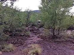 ![]() Debris (logs and rocks) along the bank of the East Verde River after flood waters receded | |