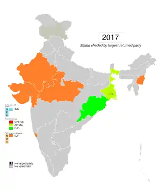 Elections were held in India on 21 July and 8 August 2017 as nomination contests by state legislators routinely for ten members of the Rajya Sabha across three states, replacing those who retired in July and August 2017.[1] The State Legislatures which contribute in this six-year minor elections/nomination cycle are Goa, Gujarat and West Bengal. The mechanism is the single transferable vote (STV) among legislators, meaning nominations may be unopposed contests (commonly in states with an absolute majority for a particular party in its legislative, public elections). The open ballot is used rather than secret ballot, allowing public scrutiny.
