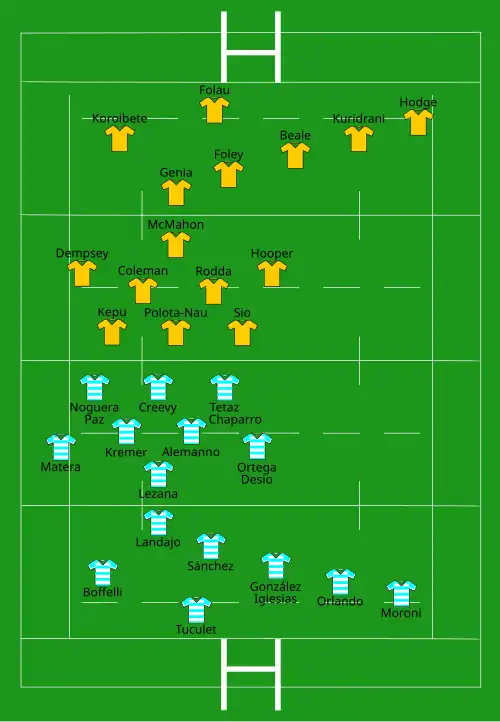 | Try: Folau (2) 28' c, 54' c Kepu 48' c Genia 71' c Phipps 73' c Uelese 80' c Con: Foley (6/6) 30', 49', 54', 73', 75', 80' Pen: Foley (1/1) 5' | Report[18] | Try: Landajo 22' c Moroni 77' c Con: Sánchez (2/2) 23', 78' Pen: Sánchez (2/3) 14', 35' |