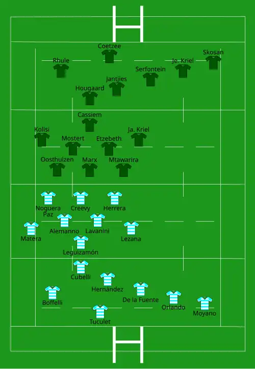 | Try: Moyano 27' c Moroni 58' c Con: Hernández (1/1) 28' Sánchez (1/1) 59' Pen: Boffelli (2/2) 3', 60' Hernández (1/1) 43' | Report[11] | Try: Kolisi (2) 19' c, 48' c Jantjies 38' c Penalty try 56' du Preez 77' c Con: Jantjies (4/4) 20', 38', 48', 79' Pen: Jantjies (2/4) 27', 71' |