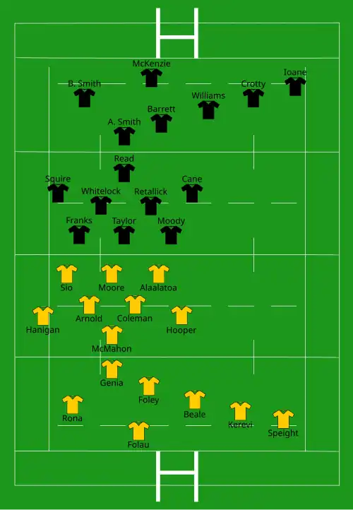 | Try: Ioane 21 c A. Smith 40' c B. Barrett (2) 60' c, 77' c B. Smith 70' c Con: B. Barrett (5/5) 22', 40', 62', 72', 78' | Report[7] | Try: Folau 1' m Hooper 10' c Foley 14' m Genia 66' m Beale 76' c Con: Foley (2/5) 11', 76' |