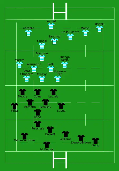 | Try: Milner-Skudder 7' m Lienert-Brown 17' m Dagg 36' m Fifita 50' c McKenzie 62' c B. Barrett 77' c Con: Sopoaga (3/3) 52', 64', 79' Pen: Sopoaga (1/2) 69' | Report[13] | Try: Sánchez 40' c Con: Sánchez (1/1) 40' Pen: Sánchez (2/3) 13', 49' Boffelli (2/2) 24', 42' Drop: Sánchez (1/1) 28' |