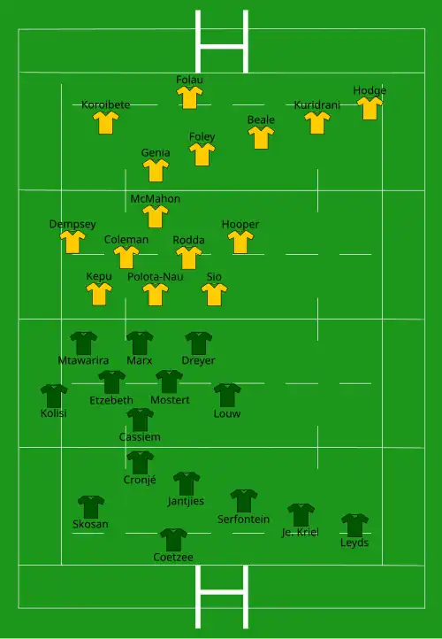 | Try: Beale 26' c Polota-Nau 46' c Con: Foley (2/2) 28', 47' Pen: Foley (3/3) 7', 40', 69' | Report[14] | Try: Je. Kriel 24' c Marx 58' c Con: Jantjies (2/2) 26', 59' Pen: Jantjies (3/3) 3', 53', 67' |