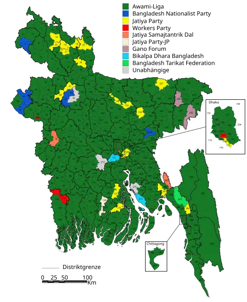- ^ The voting figures of the Awami League does not include the votes for 13 candidates of allied registered parties who contested on the Awami League 'boat' symbol