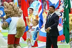 Zabivaka (English: "The one who scores"), was the official mascot for the 2018 FIFA World Cup and was voted for by a 53% margin. The design is of a wolf who represents fun, charm, and character.[4] Former world cup winning, Brazilian striker Ronaldo was another mascot of the tournament. Ronaldo was the intended man to deliver the ceremonial first kick of the tournament but instead, he gave that honor to the child mascot who passed the official match ball to Zabivaka in order to start the tournament. The match ball (an Adidas Telstar 18) was sent into space with the International Space Station crew in March and came back to Earth in early June.[5]