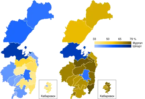 The second round was held on 23 September, between the top two candidates, the Liberal Democratic candidate Sergei Furgal and the incumbent Governor Vyacheslav Shport, nominated by the United Russia.[1] Both of them scored 35% of the vote in the first round. In the second round, Sergei Furgal was elected Governor of Khabarovsk Krai with 69.57% of the vote.