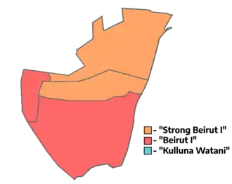 As per the new Vote Law adopted by parliament on June 16, 2017, the electoral districts of Beirut were reorganized. The old Beirut I district merged with the Medawar quartier (previously in Beirut II), the new district retaining the name 'Beirut I'.[3][4] The new Beirut I district received the two Armenian Orthodox seats of the former Beirut II district, whilst the Minorities seat was shifted from the Muslim-domonated Beirut III district to the new Beirut I district.[3][4]