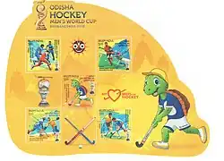 A miniature sheet and stamp of Odisha Men's Hockey World Cup 2018 Bhubaneswar.Olly: Mascot of the 2018 hockey World Cup with Odisha Chief Minister Naveen PatnaikFIH 2018 Captains with Chief Minister of Odisha at Bhubaneswar