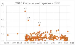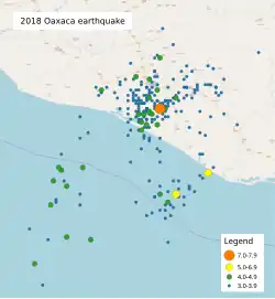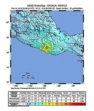 The 2018 Oaxaca earthquake occurred on February 16, 2018, at 17:39 local time (23:39 UTC) in the Sierra Madre del Sur mountains in Oaxaca state in Southern Mexico. It had a magnitude of 7.2 on the moment magnitude scale and a maximum felt intensity of VII (Very strong) on the Mercalli intensity scale. The hypocenter was located at a depth of 24.6 km and approximately 37 km northeast of Pinotepa de Don Luis.[2] There were only two reports of injuries from the earthquake, but later a military helicopter surveying the damage crashed and killed 14 people. There were also 15 people injured.[3][4]