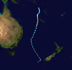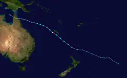 On 26 January, a low-pressure system formed to the east of the Solomon Islands, centred within a very long low-pressure trough stretching from Western Australia to the central South Pacific Ocean.[45][46] The low-pressure system tracked generally towards the west over the following days, moving into the Australian region from the South Pacific basin on 27 January.[47] On 3 February, a few days after the low-pressure trough had evolved into a monsoon trough,[48] the BOM noted that the low-pressure system had developed into a tropical low.[49] At the time, the atmospheric environment was assessed as being unfavourable for tropical cyclogenesis; however, the BOM indicated that conditions were likely to become more conducive over the following week.[49] The system moved eastwards onto the boundary of the region—the 160th meridian east—at approximately 06:00 UTC on 4 February,[50] before returning to the Australian region proper later that day.[51] By 06:00 UTC on 5 February, however, the system had moved eastwards out of the Australian region once again.[52] The system later intensified into a tropical cyclone while tracking southwards in the South Pacific basin, and was named Uesi by the Fiji Meteorological Service (FMS). Uesi reached peak intensity as a Category 3 severe tropical cyclone to the northwest of New Caledonia.