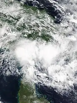 On 4 January, the BOM noted the formation of a weak tropical low over Indonesia's Maluku Islands.[22] In the ensuing days, the tropical low tracked slowly southeastwards across the Arafura Sea, towards the Gulf of Carpentaria. Significant development was hampered by strong vertical wind shear; however, very warm sea surface temperatures of up to 32 °C (90 °F) allowed the low to gradually increase in organisation.[23] On 7 January, shortly after the low passed near Cape Wessel in the Northern Territory, the BOM published their first forecast track map for the system, and issued a tropical cyclone watch for the northern coastline of Arnhem Land.[24] On the next day, the JTWC issued a Tropical Cyclone Formation Alert on the system as it began to organize just northwest of the Gove Peninsula.[25] As the system remained disorganized, the JTWC cancelled the first Tropical Cyclone Formation Alert, but later issued another one on 10 January as it re-organized itself, following land interaction with the Top End. It was later upgraded to a tropical cyclone by the BOM as it was northeast of Kalumburu, receiving the name Claudia on 11 January.[26] On the next day, the system was upgraded to a category 2 tropical cyclone. Several hours later, following a decrease in wind shear, Claudia's structure quickly improved, with the storm acquiring hurricane-force winds. It was then upgraded by the BOM to a severe tropical cyclone, during this intensification spell.[27]