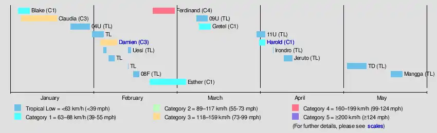 The season had an unusually late start with the first system, Blake, forming in early January, well after the official start of the season. Blake would later make landfall in northwestern Australia and soon degenerate afterwards. At the same time, Claudia, another tropical cyclone, formed. It persisted for two weeks and reached category 3 on the Australian tropical cyclone scale before dissipating west of Australia. Later that month, a tropical low formed and lasted for a week before dissipating in late January without been named. Three other tropical lows formed in late January and early February. One of them dissipated later. Another one of them has been moving in and out of the Australian region. It was designated 06F by the Fiji Meteorological Service. The third one intensified into Cyclone Damien. In late February, 2 new tropical lows formed, and were named Esther and Ferdinand. Esther didn't strengthen much, but Ferdinand went on to become a Category 3 severe tropical cyclone, equivalent to a Category 2 Atlantic Hurricane. Then in the month of March and April, two cyclones namely Gretel and Harold formed in the Coral Sea and both of them exited the basin towards the South Pacific Ocean where it intensified further. The season continued into May where two lows formed in the region of TCWC Jakarta where the latter one was named as Mangga which became the strongest Extratropical cyclone to hit Western Australia such late in the season. The season concluded on 23 May with the Extratropical transition of Cyclone Mangga.