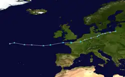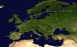 After the centre of Amélie moved inland over northern France, it gradually tracked eastwards and then north-eastwards.[47] Amélie passed over Belgium and the Netherlands on 3 November and then over Germany on 4 November, while steadily weakening.[51][52] After crossing Poland on 5 November as a weak frontal boundary,[53] Amélie stalled over the Baltic states on 6 November,[54] before being absorbed by an approaching warm front over Estonia on 9 November.[55]