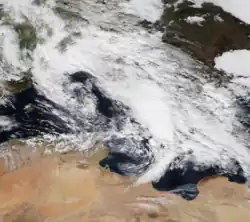 After losing its brief eye-like feature, Bernardo followed the coast of Algeria, remaining closely offshore as it moved eastwards across the Mediterranean before stalling over southern Italy for two days.[60][61][62] Bernardo then accelerated to the north-east as a weak frontal boundary, moving over the Baltic states on 14 November[63] and into northern Russia on 15 November.[64] After briefly reintensifying and then weakening once more, Bernardo was last noted as a weak low over Siberia on 18 November.[65]