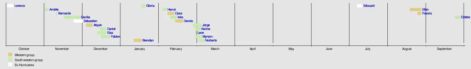 The first system of the season was Storm Lorenzo, when Met Éireann issued yellow wind warnings for Ireland and an orange warning for the western coastal counties.[10] The storm consisted of the remnants of Hurricane Lorenzo, which had turned extratropical.[11] The next named system was Amélie, named by Météo-France on 1 November.[12][13] Storm Bernardo was named next, by the Spanish meteorological agency, AEMET. This system primarily affected the Balearic Islands.[14] Cecilia was named next by AEMET, when the agency warned of rain and wind on the Iberian Peninsula and the Balearic Islands.[15]