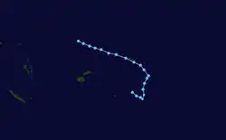 On January 10, an area of low pressure formed just east of the Solomon Islands and was forecast by the FMS to track towards the southeast, exhibiting some potential to develop further into a tropical cyclone.[60][61] The FMS designated the slow-moving complex of deep convection as Tropical Disturbance 04F on January 11; at the time, the disturbance was located within a moderate wind shear environment near Makira atop 31 °C (88 °F) ocean waters.[62] Deep convection continued to accompany the developing wind circulation over the following days as conditions grew more favourable, though the wind field remained broad and disorganised.[63][64] The FMS began issuing advisories on 04F on January 14 following improvements in the disturbance's organisation.[65] A subtropical ridge to the northeast caused 04F to track towards the east and southeast.[66] Throughout the early part of the storm's development, a strong band of convection persisted north of the centre of circulation. Following a decrease in wind shear, the FMS upgraded 04F to a tropical depression on January 15 as it began to organize.[67] Further intensification occurred as additional convection wrapped around the storm's centre on January 16, prompting the FMS to upgrade the system to a Category 1 tropical cyclone, giving the storm the name Tino.[68][69] The next day, the storm passed near Vanua Levu and strengthened further into a Category 2 cyclone as an emerged;[70][71] Category 3 intensity was reached later that day with 10-minute sustained winds estimated at 120 km/h (75 mph).[72] However, Tino soon began to entrain dry air, resulting in a gradual decay of its convection and subsequent weakening on January 18 as the center tracked across Ha'apai.[73][74] Interaction with a baroclinic zone the next day signaled the onset of extratropical transition;[75] Tino fully completed this processes later on January 19.[76]