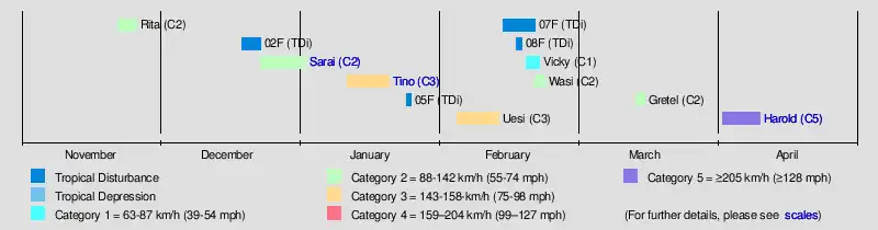 The season began with the arrival of Tropical Depression 01F on November 22, near the Solomon Islands, which would later become Tropical Cyclone Rita. Rita would then peak as a Category 3 on the Australian scale. Tropical Disturbance 02F was designated sometime later, but didn't last long after that. Sarai formed on December 23, lasting into the new year before finally ceasing to exist on January 2. Not too long after that, Tino formed and affected eastern Fiji and the surrounding area before dissipating. On January 24, a depression formed and dissipated the next day without been named. In early February, another low originally in the Australian region crossed the 160th meridian east and emerged in the South Pacific. It strengthened into severe tropical cyclone Uesi and affected New Caledonia and New Zealand. In mid-February four disturbances formed, 07F, 08F, 09F and 10F. 07F & 08F dissipated before becoming tropical depressions but the other 2 strengthened into tropical cyclones Vicky and Wasi. In mid March, Gretel entered the basin. It dissipated shortly afterwards. In early April, Harold also entered the basin from the Australian region. It rapidly intensified into a Category 5 Severe tropical cyclone as it impacted Vanuatu.
