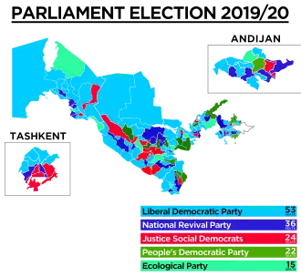 Parliamentary elections were held in Uzbekistan on 22 December 2019, with a second round in 25 of the 150 constituencies on 5 January 2020.[1] They were the first elections to be held after the death of Islam Karimov in 2016.[2] The ruling Uzbekistan Liberal Democratic Party remained the largest party in the Legislative Chamber, winning 53 of the 150 seats. All five parties contesting the elections were regarded as loyal to President Shavkat Mirziyoyev.[3]