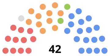 Last election 10 seats, 30.0% 17 seats, 35.2% 14 seats, 25.9%