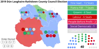 An election to all 40 seats on Dún Laoghaire–Rathdown County Council was held on 24 May 2019 as part of the 2019 Irish local elections. Dún Laoghaire–Rathdown was divided into six local electoral areas (LEAs) to elect councillors for a five-year term of office on the electoral system of proportional representation by means of the single transferable vote (PR-STV).