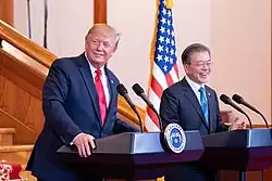 On June 24, 2019, the Blue House confirmed that Trump would be making a visit to South Korea on June 30 and that the White House was trying to schedule a visit to the Korean Demilitarized Zone. On the morning of June 29, at the G20 summit, Trump tweeted, "If Chairman Kim of North Korea sees this, I would meet him at the Border/DMZ just to shake his hand and say Hello(?)!"[14] Five hours later, North Korean Foreign Minister Ri Yong-ho asked the U.S. to issue a formal notice.[15] On the evening of the same day, Ri Yong-ho met with Stephen Biegun, the U.S. State Department's Special Representative for North Korea, at Panmunjom, in preparation for the summit.[16][17][18] During the South Korea–U.S. Summit, South Korean president Moon Jae-in announced that Trump would be meeting Kim during his visit at the DMZ.[19] Moon predicted that a handshake between Trump and Kim at the DMZ would be a "milestone" for denuclearization efforts on the peninsula.[20]