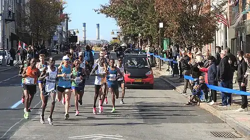 In the women's race Linden broke away from the leading pack and had built up a 15-second gap by 8 miles (13 km) which extended to 31 seconds by mile 11, but she was later caught by a pack of four before the halfway mark. American Sara Hall dropped out with a stomach illness after 18 miles (29 km).[3][15] At 20 miles (32 km) into the race, Keitany and Jepkosgei were in the lead together,[8] but 3 miles (4.8 km) later, Jepkosgei began to pull away and had put a four-second gap between the two.[3] The lead further increased to 16 seconds by mile 25 and she eventually finished in a time of 2:22:38, 54 seconds ahead of Keitany who finished second.[3] Ruti Aga finished third in a time of 2:25:51.[15] Jepkosgei's time is the second fastest on the course, behind the 2003 performance by Margaret Okayo. She was also the youngest winner, at the age of 25, since Okayo won in 2001.[3] Sinead Diver, at 42-years-old, was the oldest woman to finish in the top five since Priscilla Welch won in 1987.[16] Jepkosgei, in addition to the $100,000 of prize money, also earned $45,000 for finishing in under 2:23:00.[15] Linden won the prize for fastest American, finishing sixth in 2:26:26.[15]