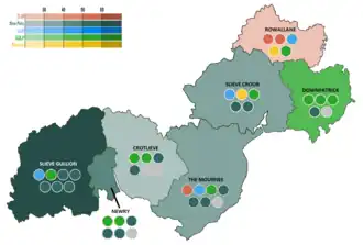 ![]() Newry, Mourne and Down 2019 Council Election Results by DEA (Shaded by the plurality of FPVs) | ||||||||||||||||||||||||||||||||||||||||||||||||||||||||||||||||||||||||||||||||||||||