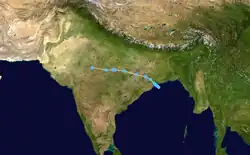 On September 28, a low pressure area formed on the adjoining areas of Saurashtra and Kutch in the state of Gujarat. The low pressure area later concentrated into a depression and moved close to Kandla at 12:00 UTC, next day. It moved east-northeastwards, towards eastern Rajasthan maintained its intensity and it developed a ragged eye until on October 1, it weakened into a low pressure area.[34]