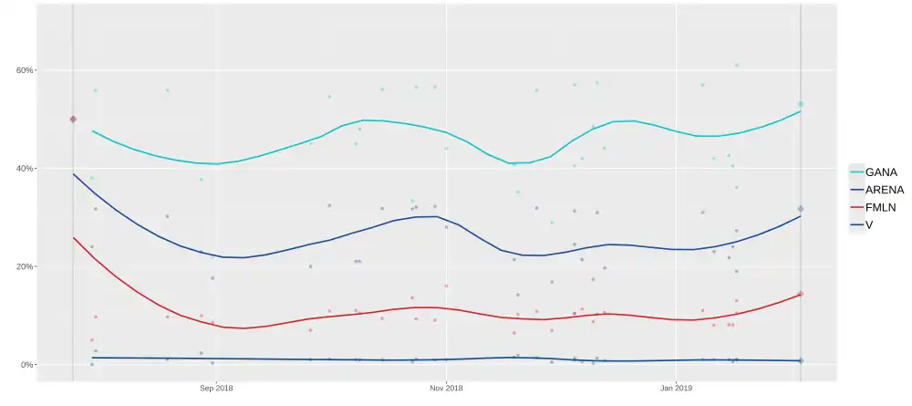 - ^ "Encuesta CONARES para las Presidenciales: GANA 61%, ARENA 19%, FMLN 13% y VAMOS 1%" [CONARES Poll for the Presidential Election: GANA 61%, ARENA 19%, FMLN 13%, and VAMOS 1%]. El Salvador Times (in Spanish). 18 January 2019. Retrieved 2 April 2023.