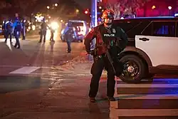 On August 23, Jacob Blake, an African-American man, was shot four times in the back during an arrest by police officer Rusten Sheskey.[88][89] The incident occurred in Kenosha, Wisconsin, as police officers were attempting to arrest Blake. In reaction to the incident, protests and unrest occurred in Wisconsin and elsewhere. On August 24 in Minneapolis, a 100-person protest over Blake's shooting took place in the city's downtown area, and after the main protest group disbanded, some protesters became violent and broke windows and threatened to breach a jail facility, resulting in 11 arrests.[90] One Minneapolis police officer suffered a broken hand during a confrontation with a demonstrator.[91]