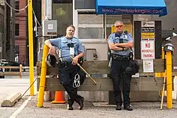 After the third precinct station burned down during the May riots, police officers worked out of the convention center in downtown Minneapolis.[105] In August, officials pursued a lease agreement for a temporary police station at a privately owned building on Minnehaha Avenue in the Seward neighborhood. A neighborhood group that supported the police abolition movement pushed back against the city and organized a "Blocked the Precinct Block party" protest rally near the site.[106] The city's lease agreement fell apart in September after opposition from community groups and threats of violence against the property owner and police officers. Police investigated threats to burn the property down and the building was tagged with anti-police graffiti, including a call for "the literal deaths of individual police officers".[105]