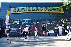 On May 27, during unrest over Floyd's murder in Minneapolis, Calvin Horton Jr., a 43-year-old man from Minneapolis, was fatally shot by the owner of the Cadillac Pawn & Jewelry shop, who believed Horton was burglarizing his business. The incident took place on East Lake Street, about one mile (1.6 km) from the main protest sites.[76][77] The shop owner was arrested the night of the shooting and held in Hennepin County Jail for several days, but was released pending further investigation.[78] There were no new developments in the case by July 21, 2020, when family and supporters of Horton protested outside the store and demanded the owner be charged with murder.[78]