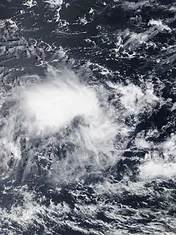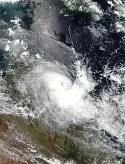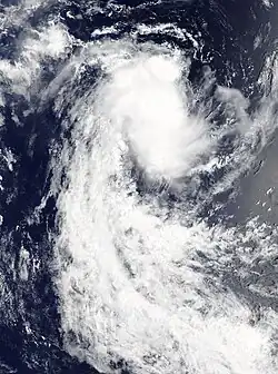 On 12 January, the Bureau of Meteorology noted that a monsoonal trough could develop within a week, that would make conditions in the Australian Region basin favorable for tropical cyclogenesis.[127] On 16 January, a weak tropical low formed to the northeast of Queensland.[128] Later that day, the Joint Typhoon Warning Center (JTWC) issued a Tropical Cyclone Formation Alert on the system.[129] At 02:10 UTC on 17 January, the Bureau of Meteorology upgraded the tropical low into Tropical Cyclone Kimi, while located northeast of Cooktown.[130] A small tropical cyclone, Kimi moved slowly southward while remaining offshore of the Australian coastline.[131] Late on 17 January, radar imagery from Cairns developed low-level convective rainbands, which wrapped into the storm's center of circulation.[132] Around this time, Kimi grew large bursts of deep convection, with a well-defined circulation visible on satellite imagery.[133] However organization began to slow on 18 January, with convection becoming displaced to the west of the center.[134] Radar from Townsville and satellite imagery showed that some unexpected wind shear had caused convection to now become displaced to the southeast of the center as the deep convection began to weaken from the wind shear. The wind shear also caused Kimi began to move away from the coast of Australia.[135] Late on 18 January, Tropical Cyclone Kimi weakened into a tropical low while moving slowly away from the North Queensland coast.[136]