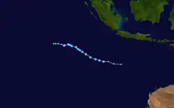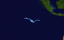 On 6 December, the Bureau of Meteorology (BOM) reported that a tropical low had developed within a monsoon trough near the western end of Java, approximately 200 km (120 mi) north-northeast of Christmas Island.[26][27] The system was assigned the official identifier code 02U upon formation.[26] Initially located in an unfavourable environment for intensification, the tropical low began to encounter somewhat improved conditions as it tracked towards the southeast.[28][29] On 7 December, warm sea surface temperatures and strong diffluence in the upper troposphere fuelled the development of deep convection around the system's low-level circulation centre. Referencing the tropical low's quickly improving structure and the presence of a weak eye feature in microwave satellite imagery, the Joint Typhoon Warning Center (JTWC) issued a Tropical Cyclone Formation Alert for the system at 05:30 UTC.[28] After tracking in a clockwise path around the northeastern side of Christmas Island, Tropical Low 02U became quasi-stationary on 8 December.[30][31] Deep convection continued to develop near the centre during the overnight period, and as the low began to track eastwards, the JTWC upgraded the system to a tropical storm on the Saffir–Simpson hurricane wind scale at 18:00 UTC on 8 December.[32]