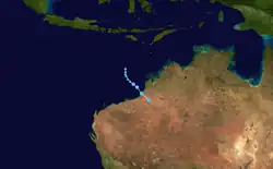The system continued towards the southwest over the ensuing hours, paralleling the coast of Western Australia. Despite tracking over land, the tropical low showed signs of organisation, with the generally favourable atmospheric conditions allowing the development of formative convective banding in the system's southern semicircle.[87] After reaching the Dampier Peninsula on 20 December, the system turned sharply to the east and began tracking further inland.[88][89] By the following day, the tropical low became slow-moving over the southeastern Kimberley region, during which time a minimum atmospheric pressure of 992.5 hPa (29.31 inHg) was recorded at Halls Creek.[90][91] During the next couple of days, the system continued moving eastward, before dissipating on 23 December.