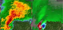 Clockwise from top: One of the only shots of the tornado at peak width near Soso. A well-built cabin swept clean at high-end EF4 strength.Satellite imagery of the scar left behind by the tornado. Violent tree damage northeast of Bassfield. Radar Imagery of the Bassfield-Soso tornado, with the right panel showcasing a very intense velocity couplet and a debris ball on the left panel. | |