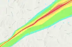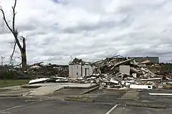 In Clarke County, the town of Pachuta was struck by the weakening tornado. Downing trees and causing minor structural damage, a metal roofing from a church was peeled off.[38] The tornado later dissipated two miles north of Pachuta. The tornado traveled 67.43 mi (108.52 km) and had a maximum estimated wind speeds of 190 mph (310 km/h) and peak width of 2.25 mi (3.62 km) wide, becoming the largest tornado ever recorded in the state of Mississippi, surpassing the Yazoo City tornado, as well as become the fourth largest tornado ever recorded, behind the 2004 Hallam tornado, the 2016 Jiangsu tornado and 2013 El Reno tornado.[39][40][41] With a path nearing 68 miles long, tying for the 23rd longest-tracked tornado on record in Mississippi.[24]