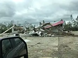 Upon entering Jasper County, the tornado explosively intensified to EF4 intensity. First Baptist Church of Moss along Jasper County Highway 537 were leveled by the tornado, church members suffered injuries but no one died.[35] Several homes nearby were reduced to rubble. Numerous homes sustained major roof damage, alongside widespread trees and power poles damage, with most of them being snapped.[16] A family of four survived the tornado by hiding in their concrete closet, the entire home was leveled with the closet still intact.[36] Along County Road 5375, a slew of mobile homes were demolished and framed homes received significant damage with more than half having their roofs removed. A small truck was thrown several hundred yards and completely mangled.[37][16]