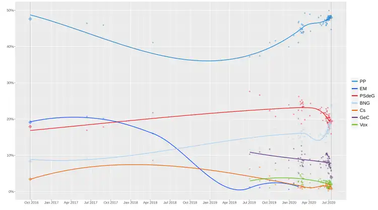 - ^ "GALICIA. Encuesta Sondaxe 26/01/2020: BNG 14,5% (11), EN MAREA 2,3%, GCE 11,8% (8), PSdeG-PSOE 21,3% (18), Cs 2,2%, PP 43,0% (38), VOX 1,9%". La Voz de Galicia (in Spanish). 26 January 2020. Archived from the original on 17 March 2020. Retrieved 26 January 2020.
