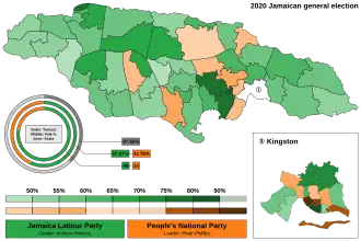 The result was a landslide victory for the ruling Jamaica Labour Party,[4] which received 57% of the vote and won 49 seats; the People's National Party remained the opposition party, losing 16 seats.[5] Amid the COVID-19 pandemic and the 2019–2020 dengue fever epidemic, voter turnout was only 38%,[6] the lowest in an election since 1983.[7]
